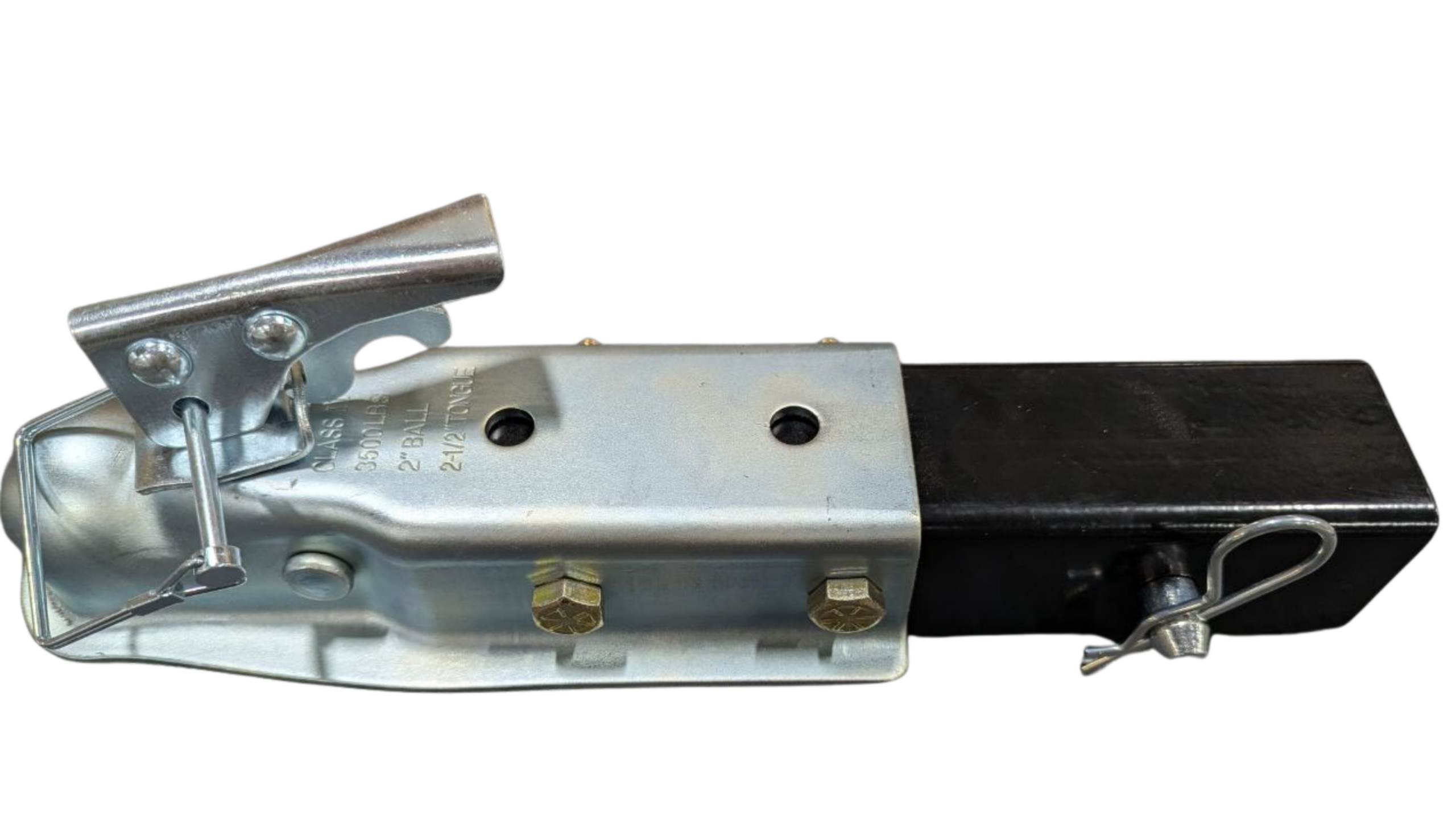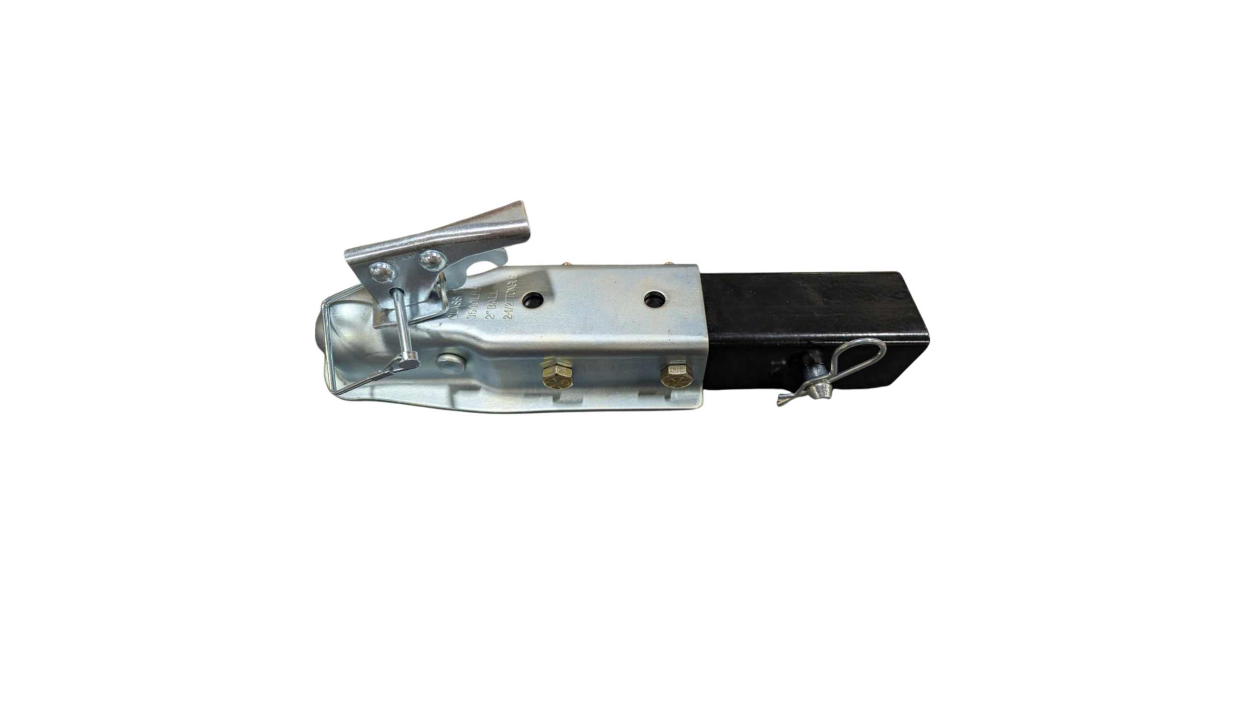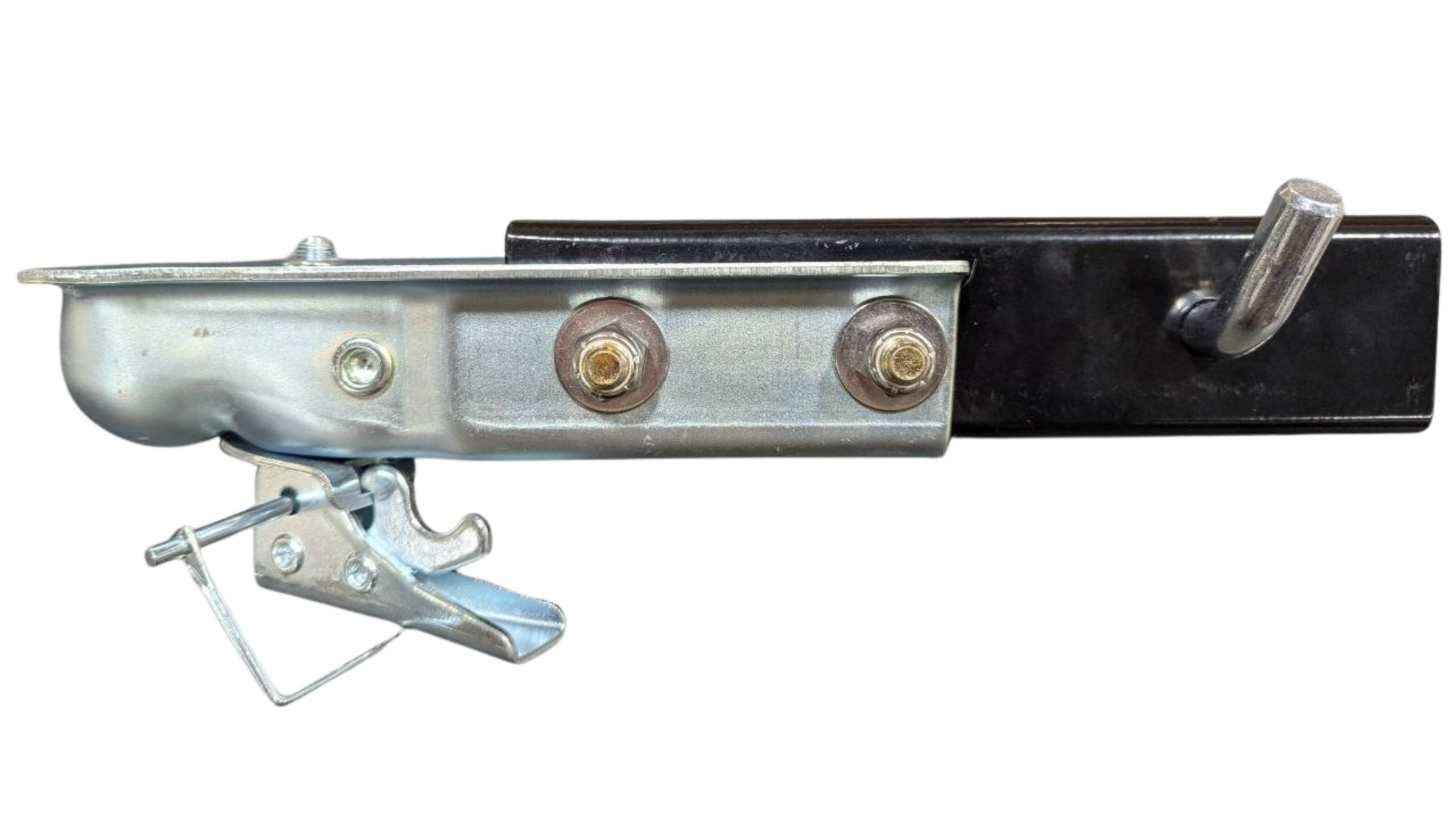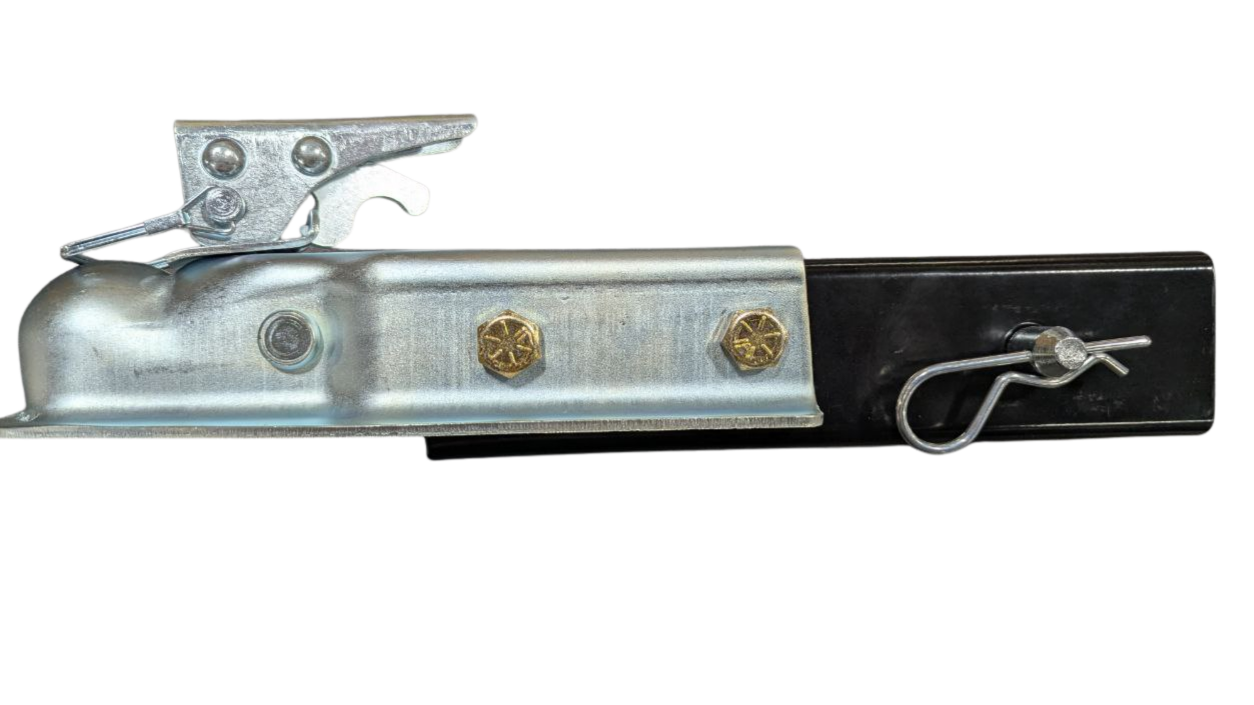 A 2-inch ball coupler mounted to a tongue extension, designed to allow the entire assembly to slide smoothly into the trailer frame. Includes receiver pin and cotter pin for securing hitch.
